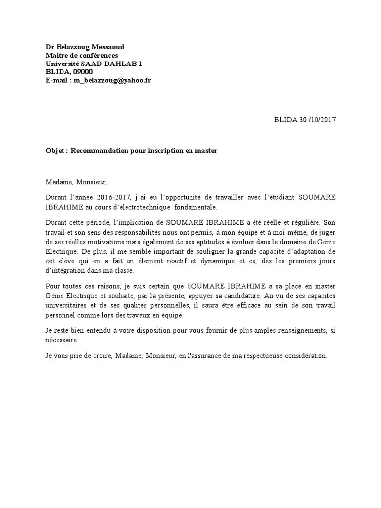 Lettre De Recommandation Universite Modele De Lettre from www.lettre-utile.fr La lettre de recommandation mentionnera vos points forts tels que votre ponctualité, votre facilité à vous intégrer et à vous adapter à un nouvel environnement, votre rigueur, votre détermination à atteindre vos objectifs, votre très grande disponibilité et tout ce qui peut vous qualifier. Exemple de lettre de recommandation pour un étudiant Lettre de recommandation pour (nom de l'étudiant) madame, monsieur, professeur à (indiquer le nom de l'établissement), j'ai eu l'occasion de compter parmi mes élèves madame (ou monsieur) (préciser le nom de l'étudiant (e)) entre 20xx et 20xx (indiquer années).